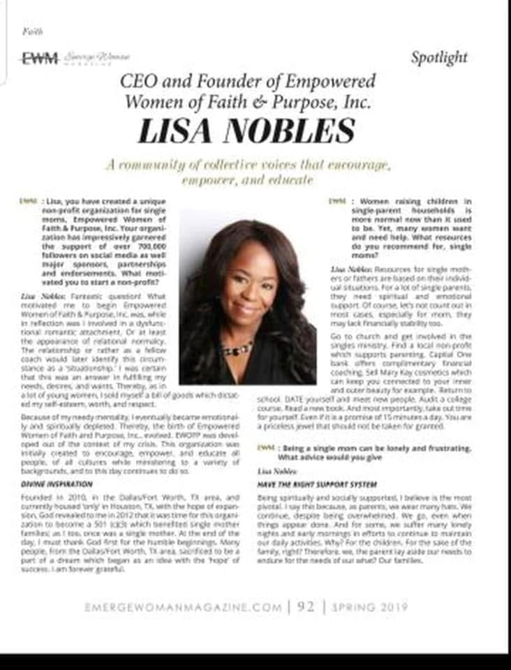 Lisa Nobles (Myself) – CEO and Founder of Empowered Women of Faith & Purpose Inc. Spring-2019